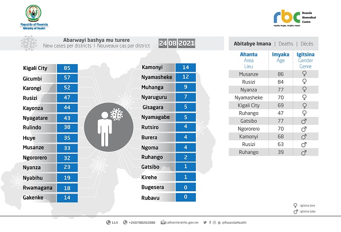 Minisiteri y’Ubuzima (MINISANTE) yatangaje ko ku wa Kabiri tariki 24 Kanama 2021 mu Rwanda abantu 11 bitabye Imana bazize Covid-19, abanduye bashya ni 608 babonetse mu bipimo 10,634.