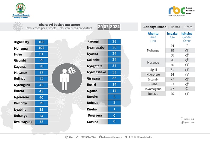 Minisiteri y’Ubuzima yatangaje ko ku wa Kane tariki 29 Nyakanga 2021 mu Rwanda habonetse abanduye Covid-19 bashya 965 bakaba babonetse mu bipimo 9,875. Abantu 11 bitabye Imana kubera icyo cyorezo, bituma umubare w’abamaze gupfa bose uba 787. Abitabye Imana ni bagore 2 n’abagabo 9.