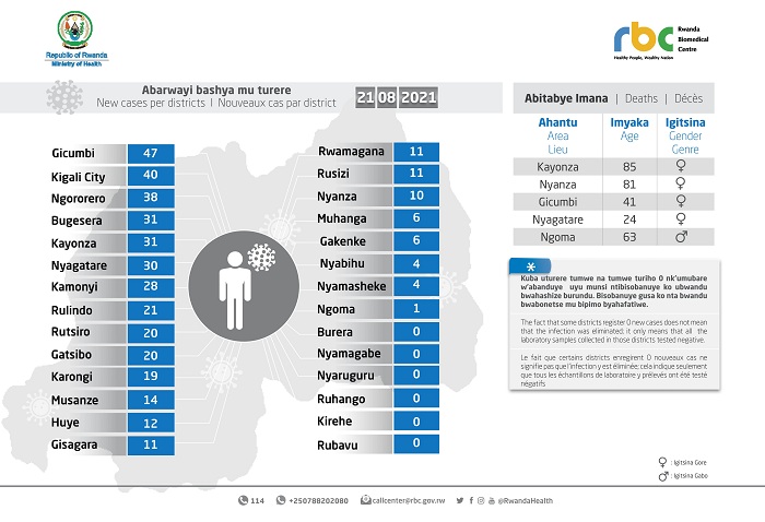 Minisiteri y’Ubuzima (MINISANTE) yatangaje ko ku wa Gatandatu tariki 21 Kanama 2021 mu Rwanda habonetse abanduye Covid-19 bashya 415, babonetse mu bipimo 16,143.