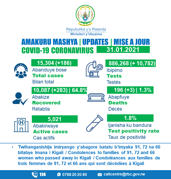 Kugeza ku Cyumweru, mu Rwanda abari bamaze kwandura icyo cyorezo ni 15,304 muri bo abamaze gukira ni 10,087 naho abakivurwa ni 5,021.