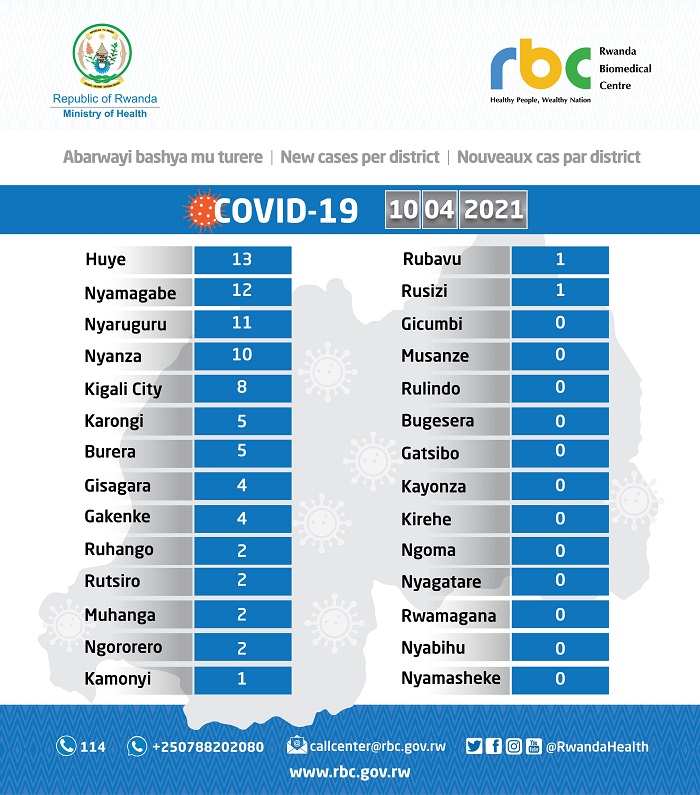 Minisiteri y’Ubuzima (MINISANTE) yatangaje ko ku wa Gatandatu tariki 10 Mata 2021, mu Rwanda habonetse abantu 83 bashya banduye Covid-19, buzuza umubare w’abamaze kuyandura bose hamwe wa 23,343. Abakize icyo cyorezo kuri uwo munsi ni 81, abakirimo kuvurwa ni 1,957.