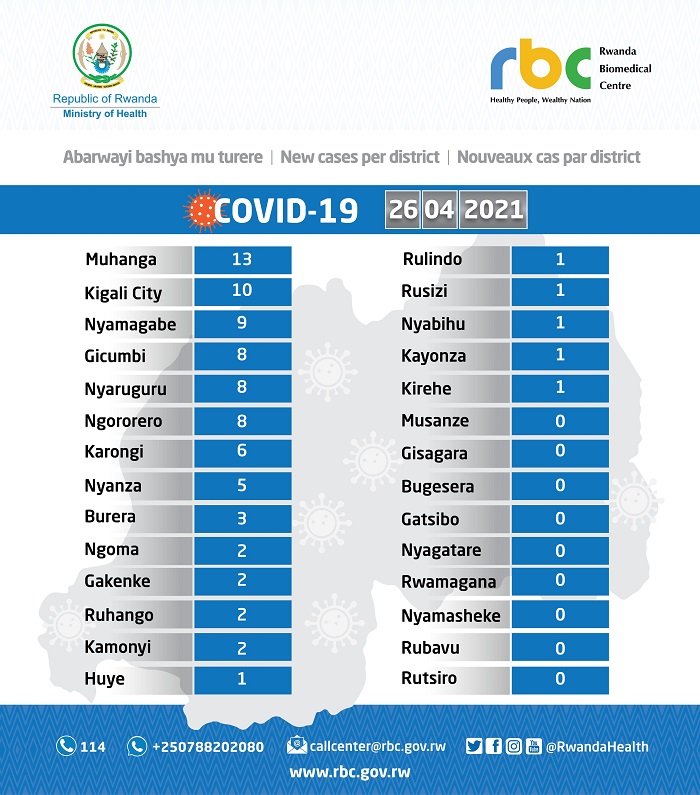 Minisiteri y’Ubuzima (MINISANTE) yatangaje ko ku wa Mbere tariki 26 Mata 2021, mu Rwanda habonetse abanduye bashya 84 naho abakize bakaba ari 64.