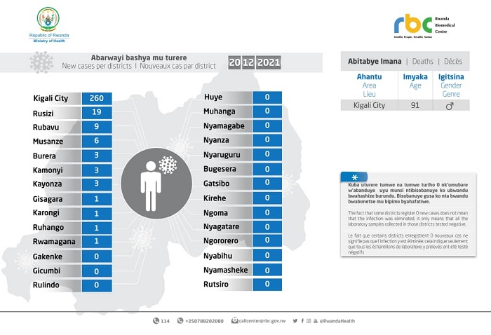 Minisiteri y’Ubuzima (MINISANTE) yatangaje ko ku wa Mbere tariki 20 Ukuboza 2021 mu Rwanda habonetse abanduye Covid-19 bashya 307, bakaba babonetse mu bipimo 17,390.