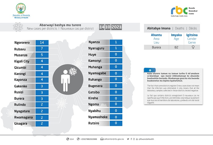 Minisiteri y’Ubuzima (MINISANTE) yatangaje ko ku wa Kane tariki 14 Ukwakira 2021 mu Rwanda habonetse abanduye Covid-19 bashya 61, bakaba babonetse mu bipimo 8,376.
