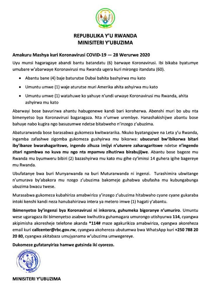 Minisiteri y’Ubuzima (MINISANTE) yatangaje ko kuri uyu wa Gatandatu tariki 28 Werurwe 2020 hagaragaye abandi bantu batandatu barwaye Coronavirus. Ibi byatumye umubare w’abarwaye Coronavirus mu Rwanda ugera kuri mirongo itandatu (60).