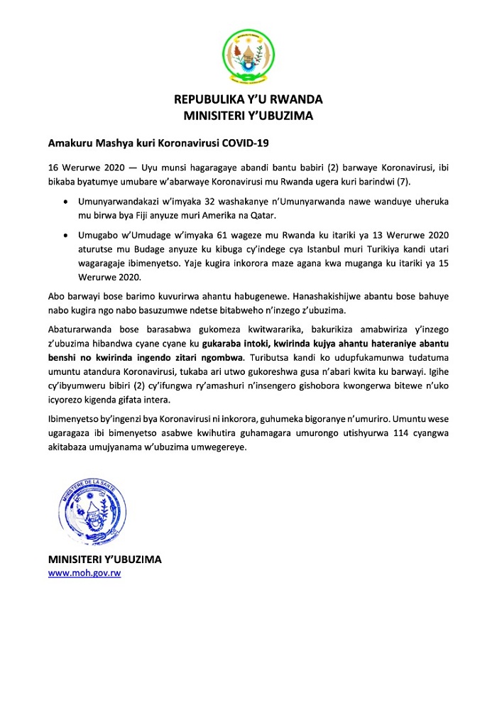 Amakuru mashya ya Minisiteri y’Ubuzima aravuga ko mu Rwanda kuri uyu wa mbere tariki 16 Werurwe 2020, hagaragaye abandi bantu babiri barwaye Coronavirus, nk’uko itangazo rya Minisiteri y’Ubuzima ribivuga.