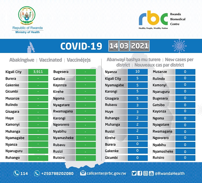 Minisiteri y’Ubuzima yatangaje ko ku Cyumweru tariki 14 Werurwe 2021, mu Rwanda abantu 66 bakize COVID-19. Habonetse abanduye bashya 43, bituma abakirwaye bose hamwe baba 1340. Abantu bane mu bari barwaye bitabye Imana i Kigali. Abo ni umugore w’imyaka 63 n’abagabo batatu b’imyaka 89, 75 na 62. Abarembye ni cumi na babiri. Abakingiwe ku Cyumweru ni 3,911 mu Mujyi wa Kigali.