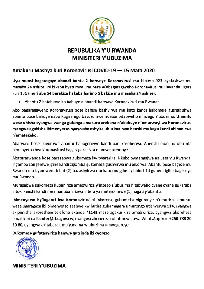 Itangazo rya Minisiteri y’Ubuzima riravuga ko abo bantu babiri byamenyekanye ko bahuye n’abandi barwaye Coronavirus mu Rwanda.