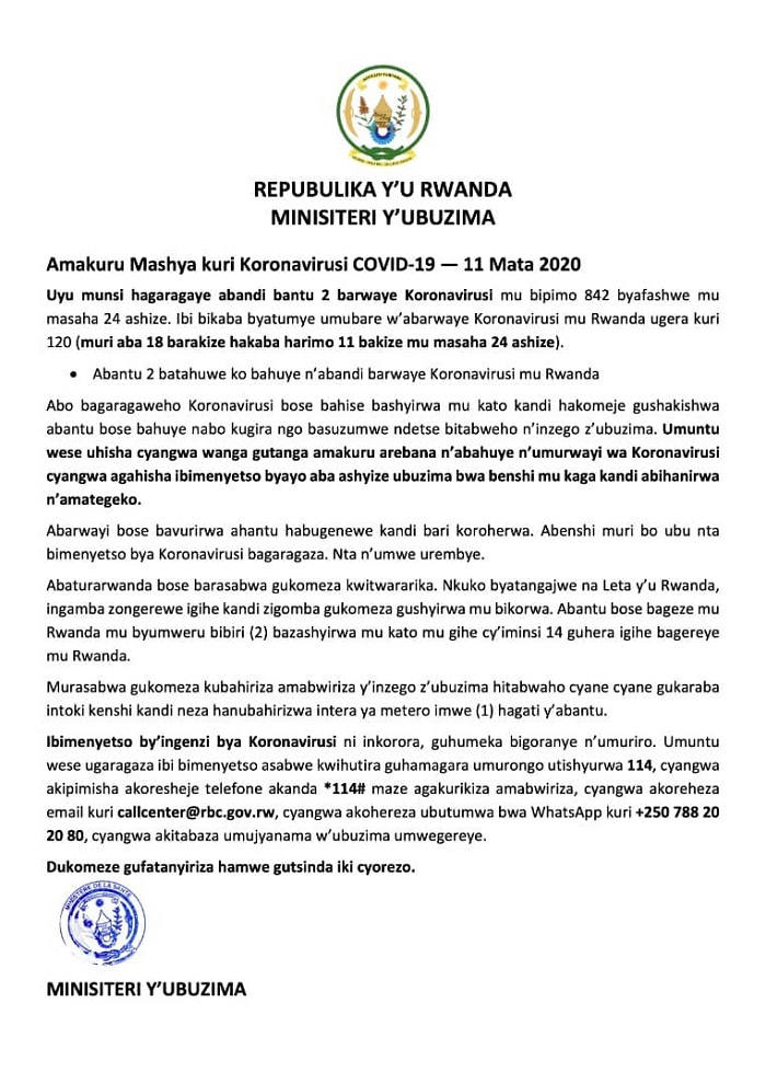 Itangazo rya Minisiteri y’Ubuzima riravuga ko abo bantu babiri byamenyekanye ko bahuye n’abandi barwaye Coronavirus mu Rwanda.