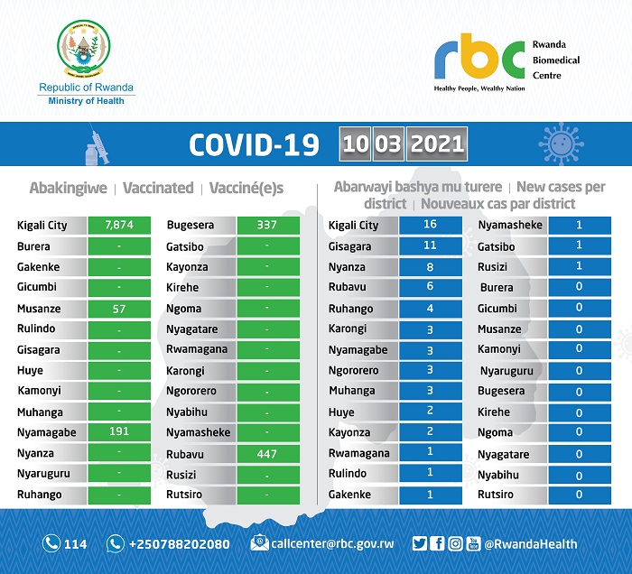 Minisiteri y’Ubuzima yatangaje ko ku wa Gatatu tariki 10 Werurwe 2021, mu Rwanda abantu 85 bakize COVID-19. Habonetse abanduye bashya 67, bituma abakirwaye bose hamwe baba 1457. Umuntu umwe mu bari barwaye yitabye Imana, abarembye bakaba ari cumi na batandatu, nk’uko imibare ibigaragaza.