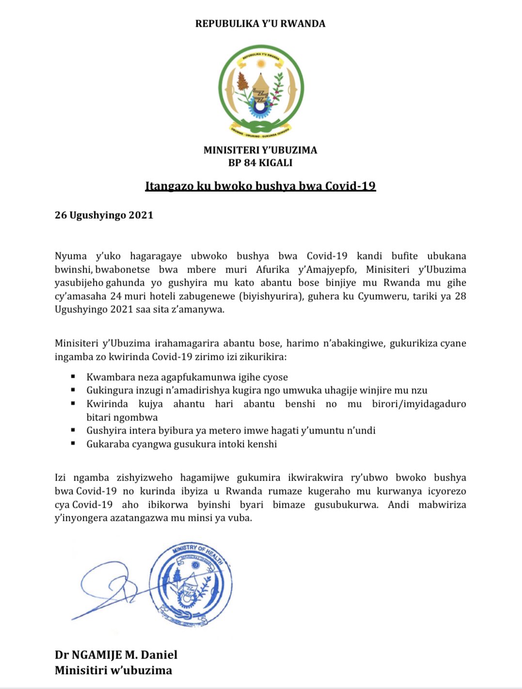 Minisiteri y’Ubuzima mu Rwanda yatangaje ko yasubijeho gahunda yo gushyira abantu bose binjiye mu Rwanda mu kato k’amasaha 24 muri hoteli zabugenewe guhera ku tariki ya 28 Ugushyingo 2021 saa sita z’amanywa.