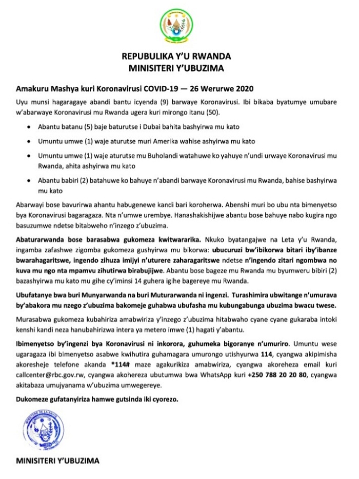 Minisiteri y’Ubuzima iratangaza ko kuri uyu wa kane tariki 26 Werurwe 2020, mu Rwanda hagaragaye abandi bantu icyenda barwaye Coronavirus. Ibi byatumye umubare w’abarwaye Coronavirus mu Rwanda ugera kuri mirongo itanu (50).