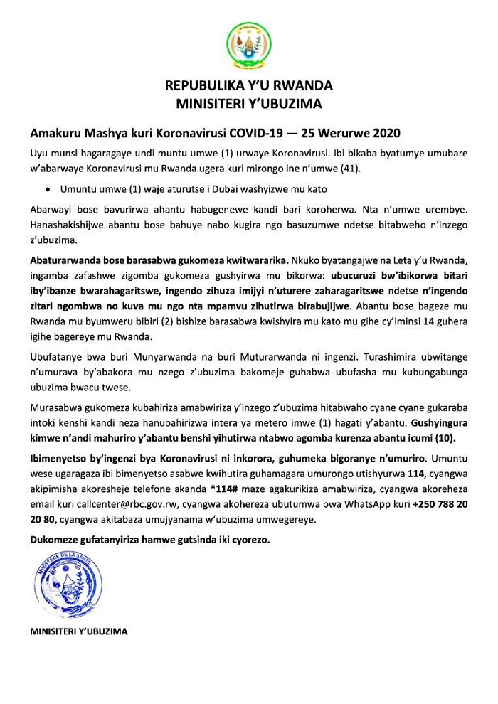 Ibi byatumye umubare w’abarwaye Coronavirus mu Rwanda ugera kuri mirongo ine n’umwe (41).