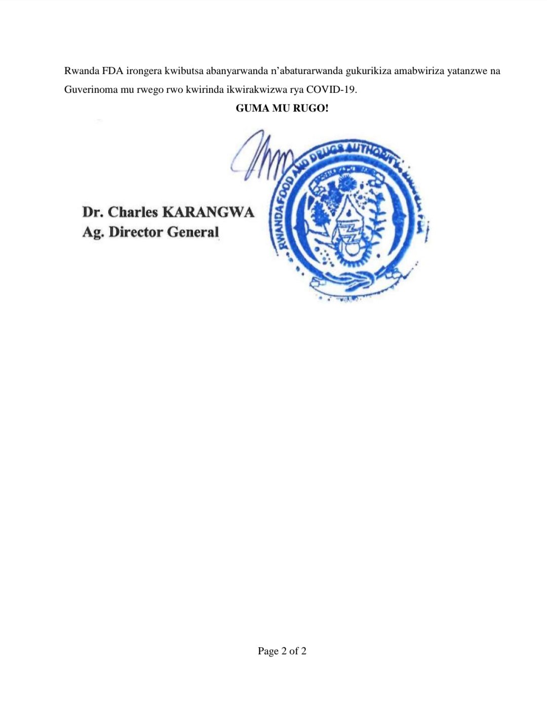 Iki kigo kandi cyongera kwibutsa Abanyarwanda n’Abaturarwanda gukurikiza amabwiriza yatanzwe na Guverinoma y’u Rwanda, mu rwego rwo kwirinda ikwirakwizwa rya COVID-19.