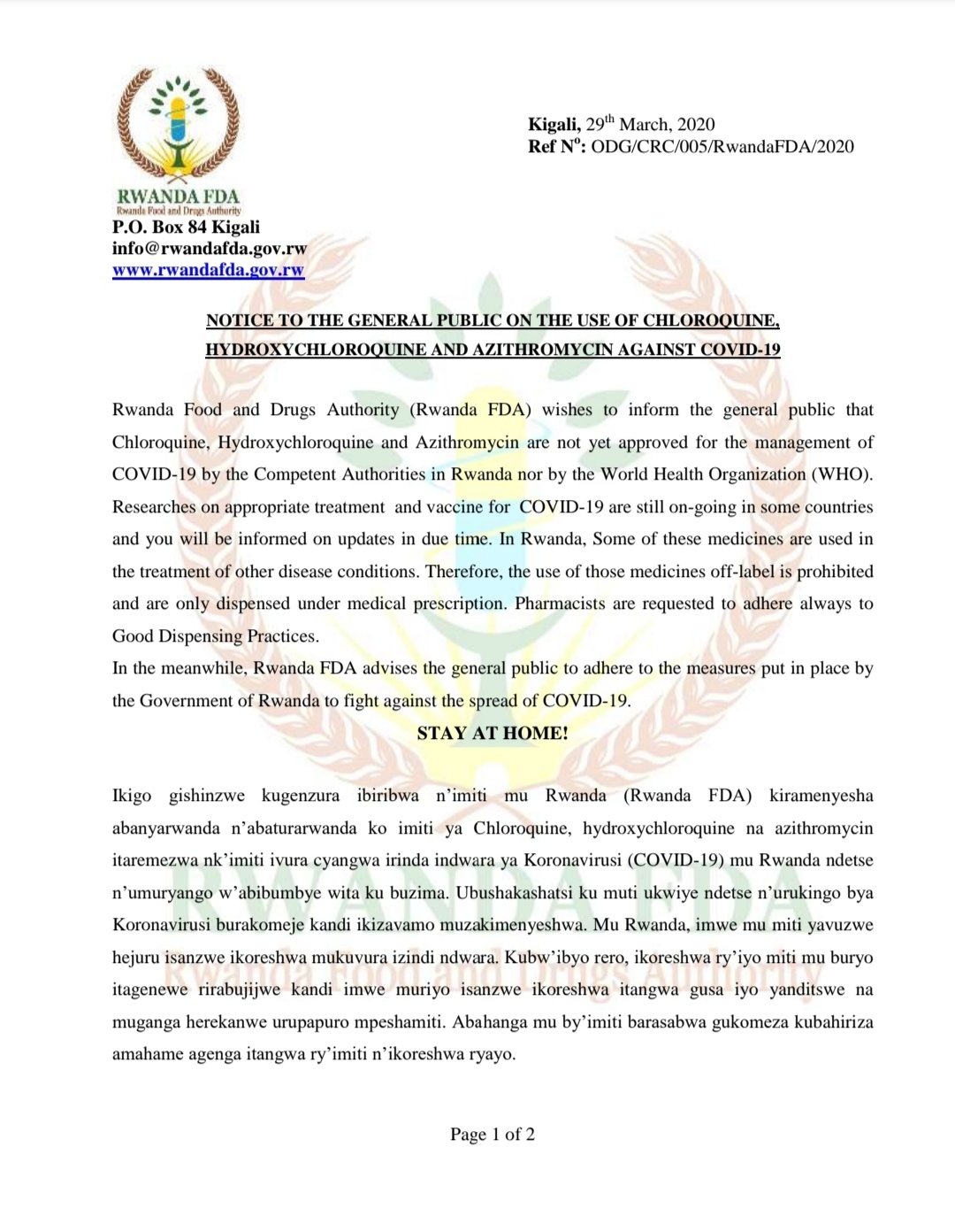 Mu itangazo icyo kigo cyasohoye, kivuga ko imiti ya Chloroquine, Hydroxychloroquine na Azithromycin, itaremezwa nk’imiti ivura cyangwa irinda kwandura indwara ya Covid-19, mu Rwanda ndetse n’Ishami ry’Umuryango w’Abibumbye ryita ku Buzima.