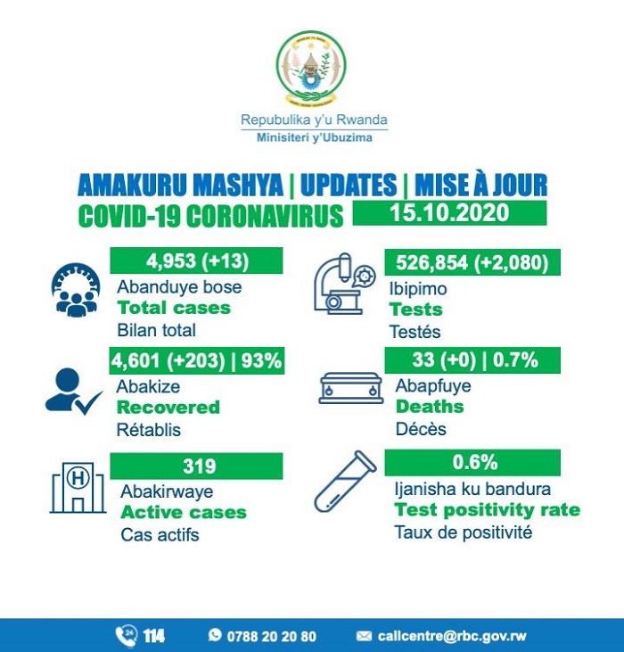 Minisiteri y’Ubuzima yatangaje ko kuri uyu Kane tariki 15 Ukwakira 2020, mu Rwanda abantu 203 bakize COVID-19, haboneka abarwayi bashya 13.