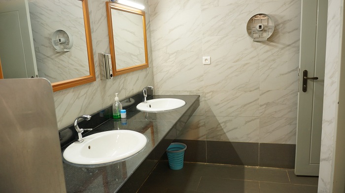 Ubuyobozi bw’iyi nyubako kandi butangaza ko ifite ubwiherero rusange 220, bivuze ko abantu hafi 10 ari bo bakoresha umuryango umwe w’ubwiherero muri iyi nyubako.