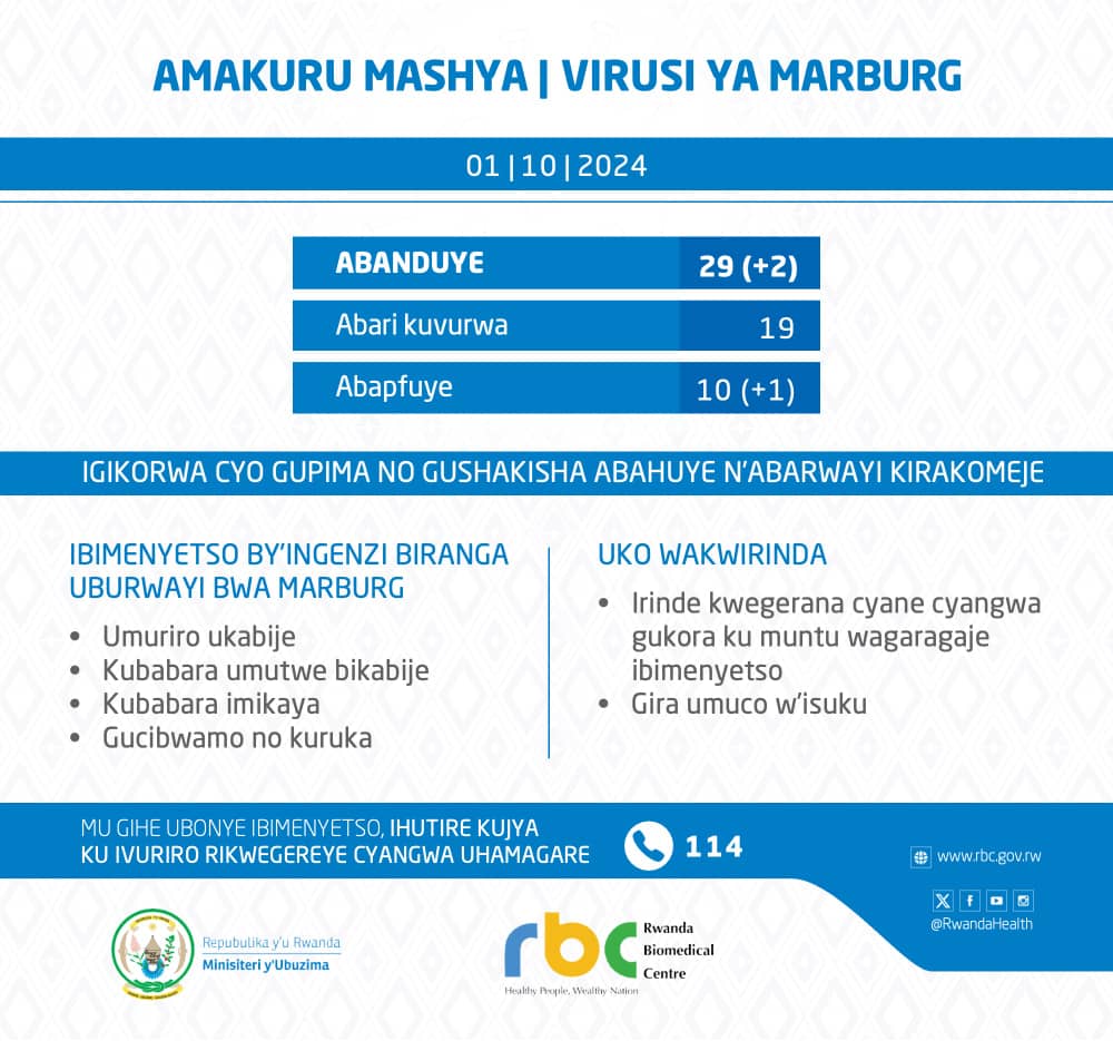 Minisiteri y’Ubuzima (MINISANTE) yatangaje ko umuntu umwe mu Rwanda kuri uyu wa Kabiri tariki 01 Ukwakira 2024, yishwe n’icyorezo cya Marburg, yuzuza umubare w’abantu icumi bamaze gupfa bazize icyo cyorezo.