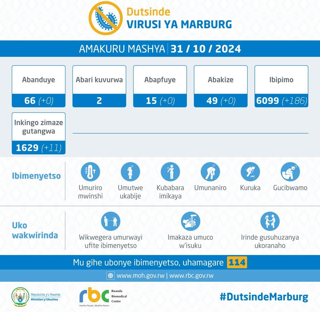 Minisiteri y’Ubuzima yatangaje ko ku wa Kabiri tariki 29 Ukwakira 2024 nta muntu mushya wabonetse wanduye icyorezo cya Marburg, nta wakize, nta n’uwapfuye, abantu batatu bakomeje kuvurwa.