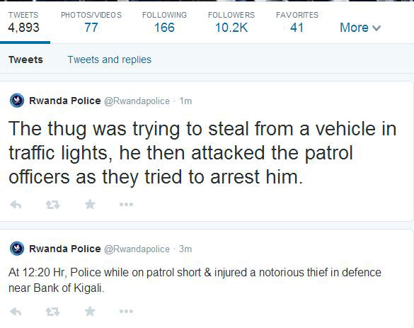 Ahagana saa sita z’amanywa kuri uyu wa kabiri tariki 06/05/2014, umuntu ucyekwaho ubujura yarasiwe mu mujyi wa Kigali hafi ya banki ya Kigali ubwo polisi yamubonaga ashaka kwiba ibintu mu modoka yagerageza kumufata akiruka.