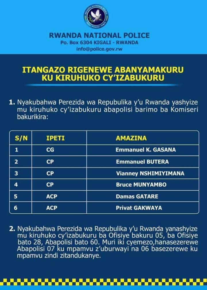 Perezida wa Repubulika Paul Kagame yashyize mu kiruhuko cy’izabukuru abapolisi barimo ba Komiseri CG Emmanuel K. Gasana, CP Emmanuel Butera, CP Vianney Nshimiyimana, CP Bruce Munyambo, ACP Damas Gatare na ACP Privat Gakwaya.