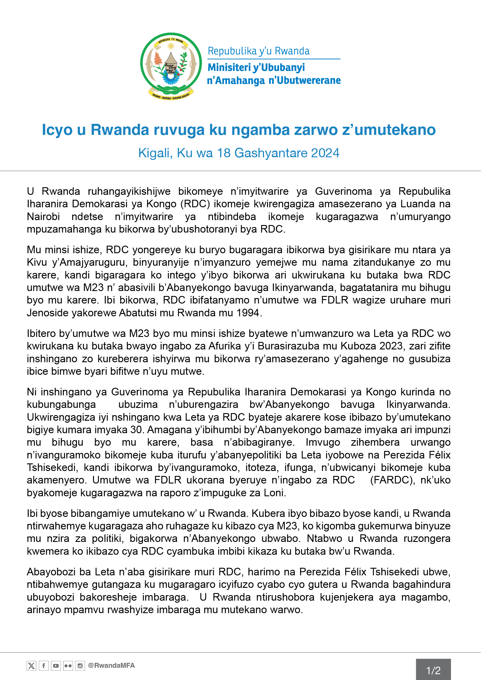 Itangazo rigira riti: “Ibi byose bibangamiye umutekano w’ u Rwanda. Kubera ibyo bibazo byose kandi, u Rwanda ntirwahemye kugaragaza aho ruhagaze ku kibazo cya M23, ko kigomba gukemurwa binyuze mu nzira za politiki, bigakorwa n’Abanyekongo ubwabo.”