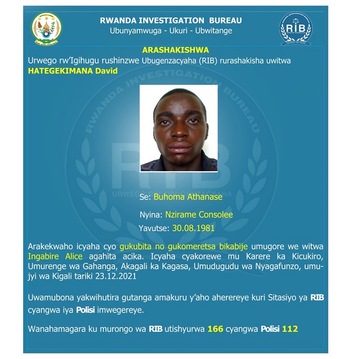 Urwego rw’Igihugu rushinzwe Ubugenzacyaha (RIB) rurashakisha uwitwa Hategekimana David ukurikiranyweho gukubita no gukomeretsa bikabije umugore we agahita acika.