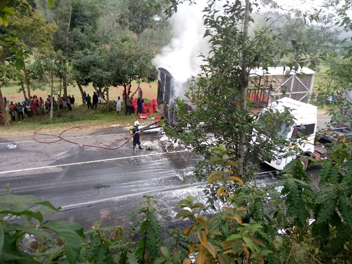 Mu muhanda Kigali - Musanze, ikamyo ya BRALIRWA ifashwe n’inkongi y’umuriro ku mugoroba wo ku cyumweru tariki 25 Kanama 2019, Polisi y’igihugu ishami rishinzwe kuzimya inkongi yihutira gutabara.