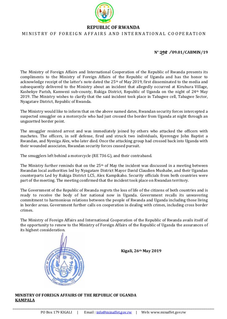 Guverinoma y’u Rwanda, ibinyujije muri Minisiteri y’Ububanyi n’Amahanga n’Ubutwererane, yagize icyo ivuga ku biherutse gutangazwa na Uganda by’ubushyamirane bwahitanye ubuzima bw’abantu babiri mu ijoro ryo ku wa gatanu tariki 24 Gicurasi 2019.