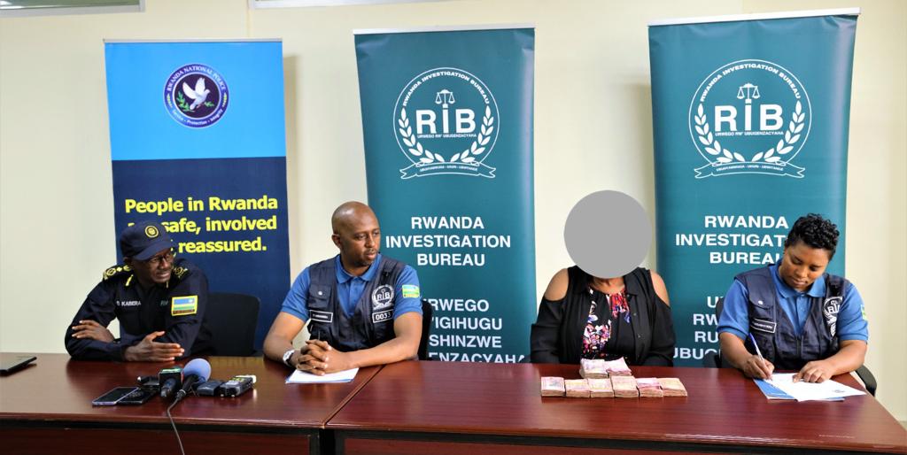 Umuvugizi wa RIB, Dr Thierry Murangira, ari kumwe na CP Kabera, bashyikirije uwibwe amafaranga ye yose uko ari 4,110,000 kuko abayibye bafashwe batarayangiza.