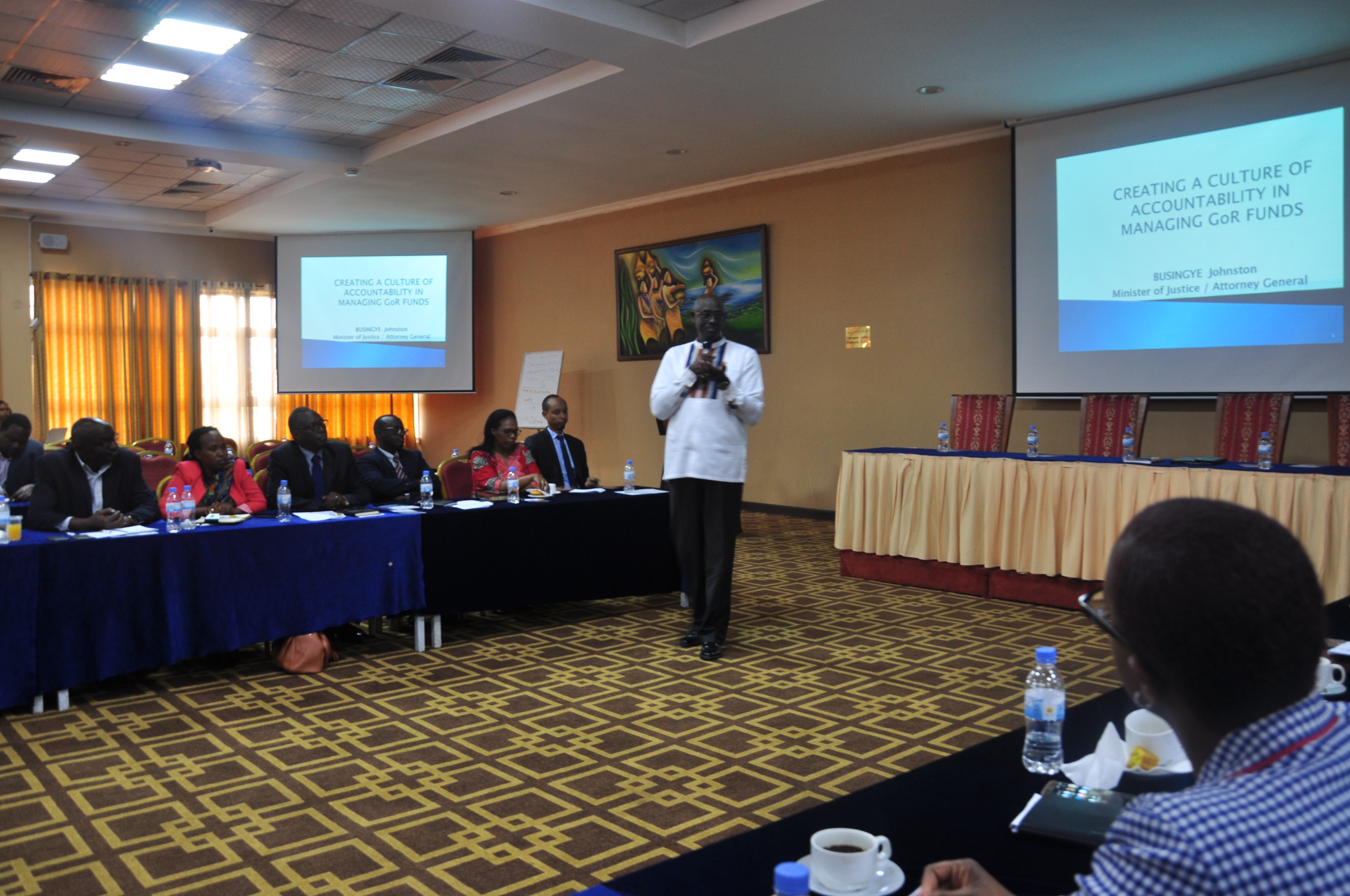 Minisitiri w’Ubutabera akaba n’Intumwa Nkuru ya Guverimo y’u Rwanda, Johnston Busingye, yabwiye abashinzwe ishyirwa mu bikorwa by’ingengo y’imari ya Leta kujya bihutira kugisha inama Minisiteri y’Ubutabera aho kugenda biguru ntege no gutsimbarara mu manza cyangwa mu bindi bintu babona bishobora guhombya Leta.