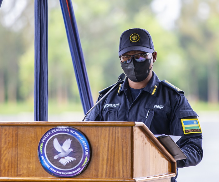 Ati“ Banyeshuri murangije amasomo yanyu uyu munsi, nk‘uko amasomo murangije yitwa ay‘ibanze, mumenye ko aribwo mugitangira umwuga wa gipolisi, mukeneye gukomeza kwiga no kwihugura aho muzaba mukorera hose. Kuba mugejeje kuri uyu munsi, mwibuke urugendo mwanyuzemo rutoroshye kuva mugeze hano bijye bibaha imbaraga zo kuzuza inshingano zanyu neza.“