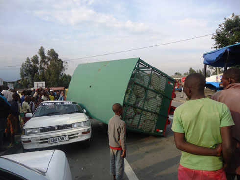 Ababonye iyo mpanuka yabaye saa kumi zishyira saa kumi n’imwe ku mugoroba wa tariki 07/01/2014, bemeza ko iyo torotoro yakatanye iryo korosi umuvuduko mwinshi cyane bituma icy’inyuma kirimo imizigo gihengama niko guhita kigwa ku ivatiri yari iparitse iruhande rw’umuhanda nk’uko Sitiveni umwe mubo iyi mpanuka yabaye areba yabidutangarije.