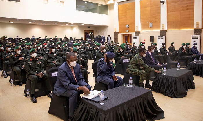 Today at @RwandaMoD HQ, President Kagame met with the RDF High Command and staff. pic.twitter.com/8KNxMUE91t