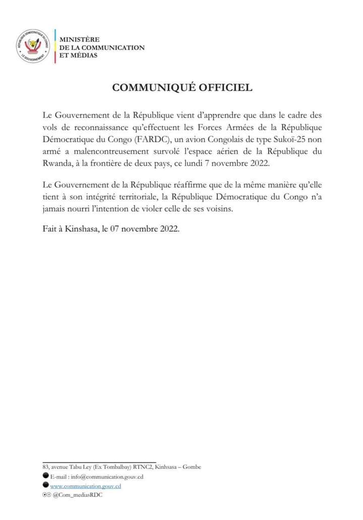 Rigira riti: "Guverinoma ya Repubulika Iharanira Demokarasi ya Congo yamenye ko indege yayo y’intambara yo mu bwoko bwa Sukhoi-25 itari ifite intwaro mu bikorwa byo kuzenguruka ikirere cya DRC, yagurutse mu kirere cy’u Rwanda tariki 7 Ugushyingo 2022."