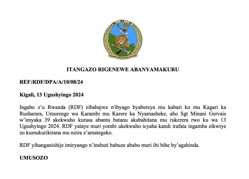 Ubuyobozi bw’ ingabo z’u Rwanda bwatangaje ko bwamaze guhagarika Sgt Minani kugira ngo azagezwe imbere y’ubutabera, Ubuyobozi bw’ ingabo z’u Rwanda bukaba bwihanganishije imiryango n’inshuti babuze ababo.