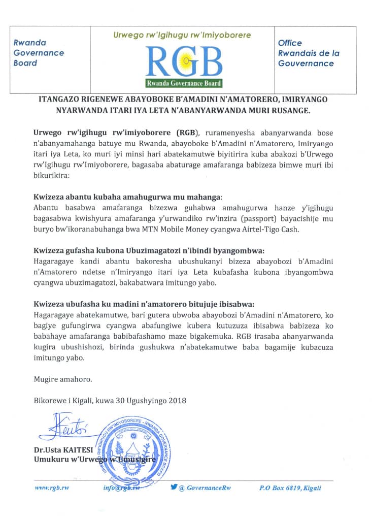 urwego rw’igihugu rw’imiyoborere myiza RGB ruraburira abantu bose , cyane cyane abanyamadini ko hadutse abatekamutwe biyitirira urwo rwego bagambiriye kubacuza utwabo.
