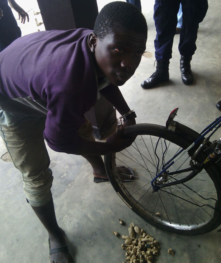 Nturanyenabo Jean Claude yafatiwe ku mupaka munini uhuza umujyi wa Goma na Gisenyi atwaye urumugi udupfunyika 120 mu mapine y’igare kuri uyu wa kabiri tariki 30/12/2014.