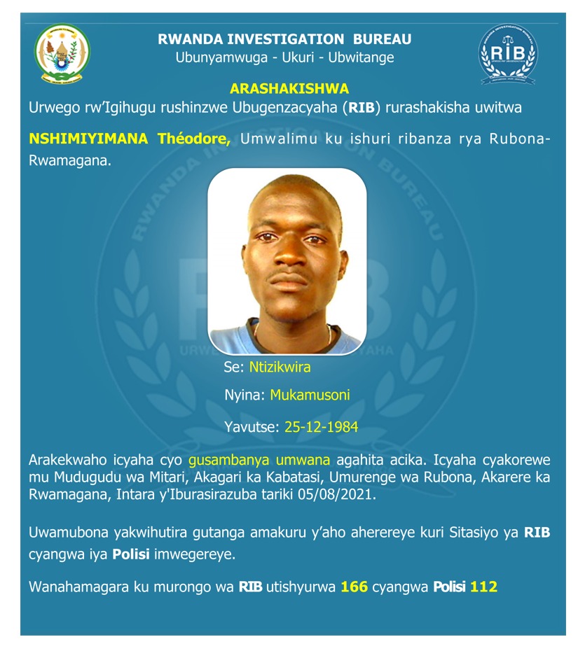 Urwego rw’Igihugu rushinzwe Ubugenzacyaha (RIB) rurashakisha uwitwa Nshimiyimana Théodore ukekwaho icyaha cyo gusambanya umwana agahita acika.