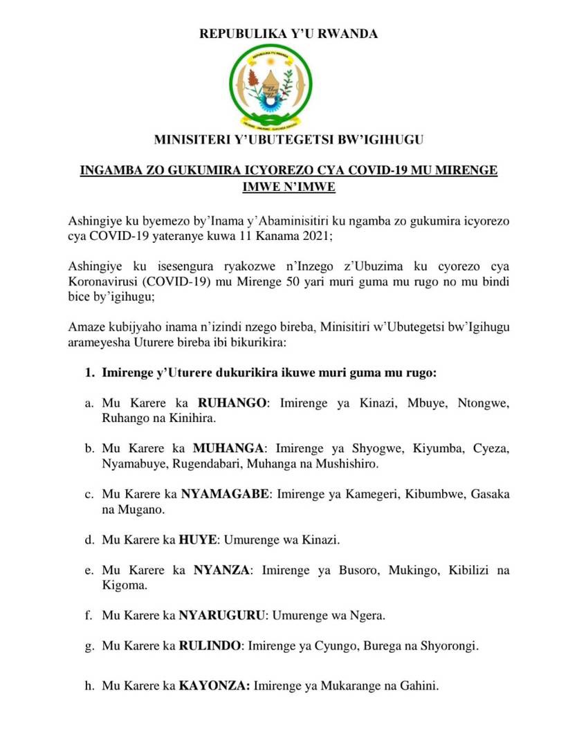 Minisiteri y’Ubutegetsi bw’Igihugu (MINALOC) yatangaje ko imirenge 40 yakuwe muri gahunda ya Guma mu Rugo, indi mirenge 10 mu yari imaze iminsi muri iyo gahunda iyigumamo kugeza tariki 31 Kanama 2021 bitewe n’uko hakigaragara ubwandu bwa COVID-19 bukiri hejuru.