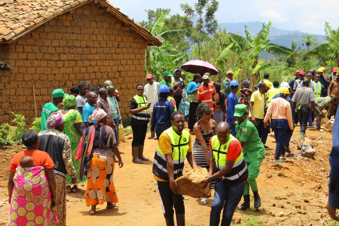 Babisabwe mu gikorwa cyo gutangiza ukwezi kw’ibikorwa by’ubukorerabushake mu Murenge wa Kibangu mu Karere ka Muhanga, ahakozwe umuganda udasanzwe wo kubaka inzu zirindwi z’abaturage basenyewe n’ibiza, zigeze mu gihe cyo gushyiraho ibisenge.