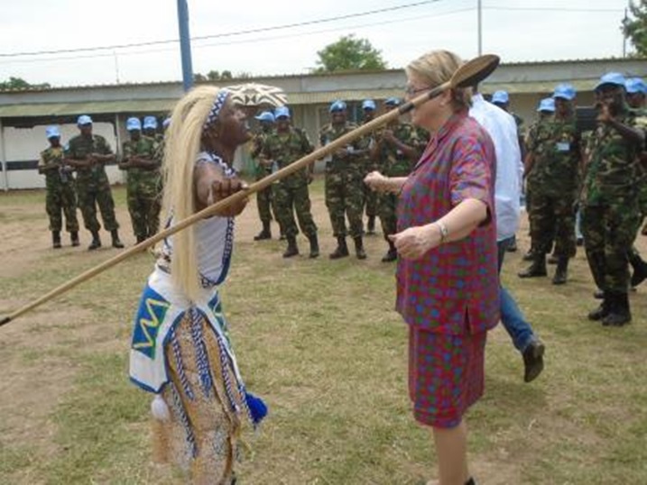 Madam Ellen Margret Loej yatemberejwe mu kigo ingabo z’u Rwanda zikambitsemo aho yanakiriwe n’Itorero ry’ababyinnyi ba Batayo ya 6 y’Ingabo z’u Rwanda bamusangije ku mudiho w’intore n’imbyino z’umuco w’Abanyarwanda.