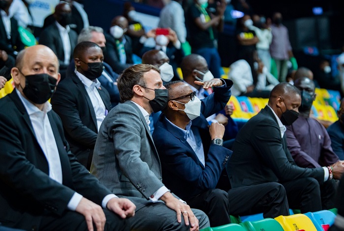 Perezida w’u Rwanda Paul Kagame na Perezida w’u Bufaransa Emmanuel Macron barebye umukino wa Basketball warangiye ikipe ya Patriots BBC yo mu Rwanda isezereye Feroviario de Maputo yo muri Mozambique.