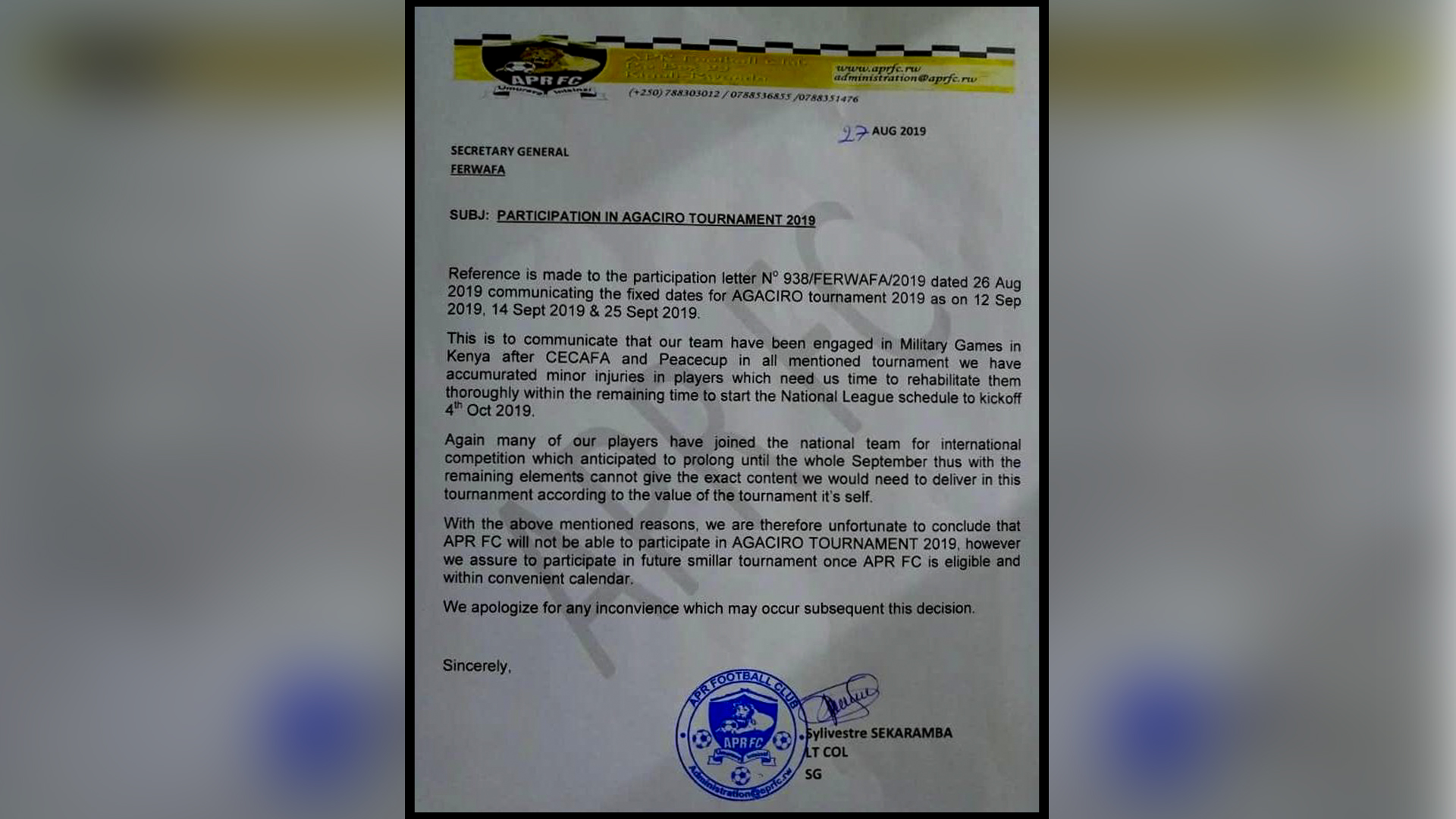 Ibinyujije ku rubuga rwayo rwa Interineti, yatangaje ko ifite umubare muto w’abakinnyi bitatuma ibasha kwitabira aya marushanwa , ubu hakaba hategerejwe umwanzuro wa FERWAFA niba izasimbuza APR FC ikipe ya Kiyovu Sports yabaye iya gatanu.