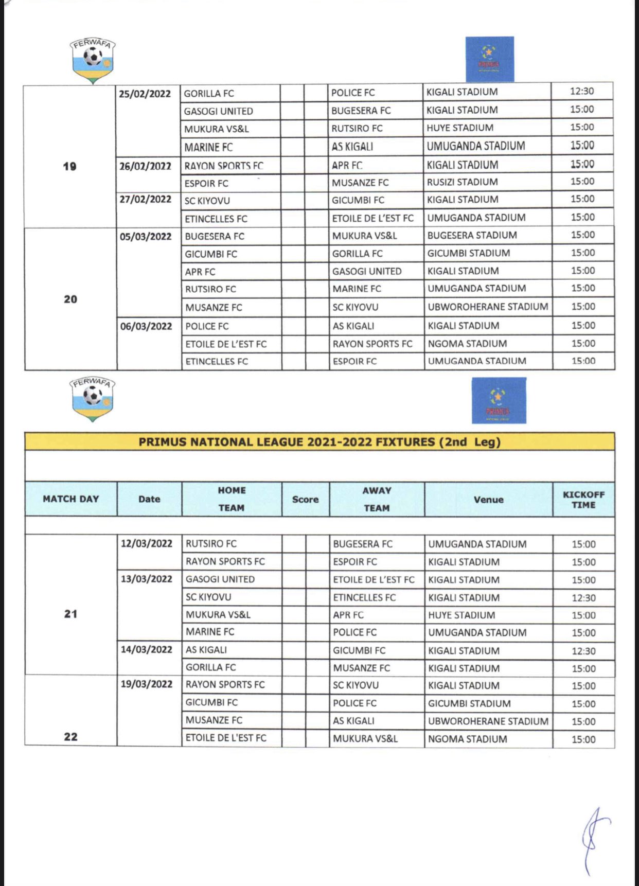 Kuri uyu wa Mbere nk’uko byari byitezwe hatangajwe ingengabihe ya shampiyona y’icyiciro cya mbere mu mupira w’amaguru, aho kuri uyu wa Gatandatu haza gutangira imikino yo kwishyura.