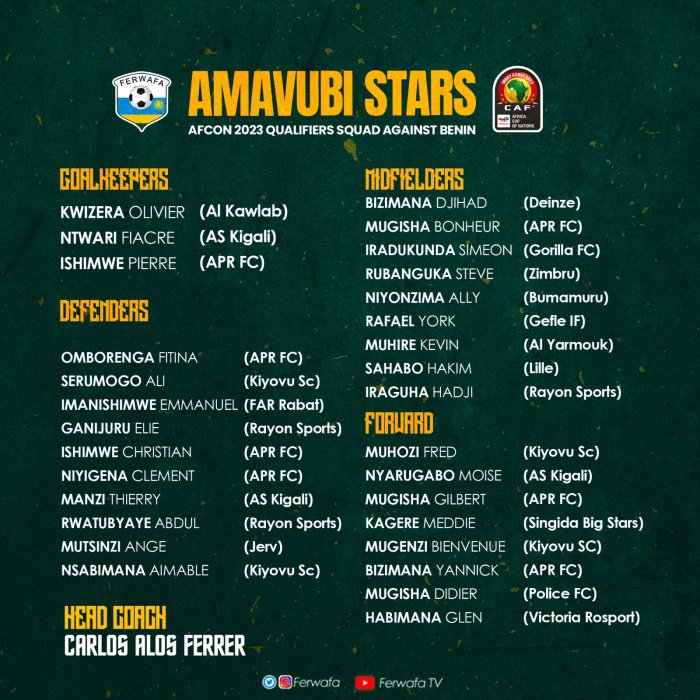 Abakinnyi 30 bahamagawe ku wa 10 Werurwe 2023, abakina imbere mu gihugu bazajya mu mwiherero ku wa Mbere tariki ya 13 Werurwe 2023, nyuma y’imikino y’umunsi wa 23 wa shampiyona irimo gukinwa muri izi mpera z’icyumweru.