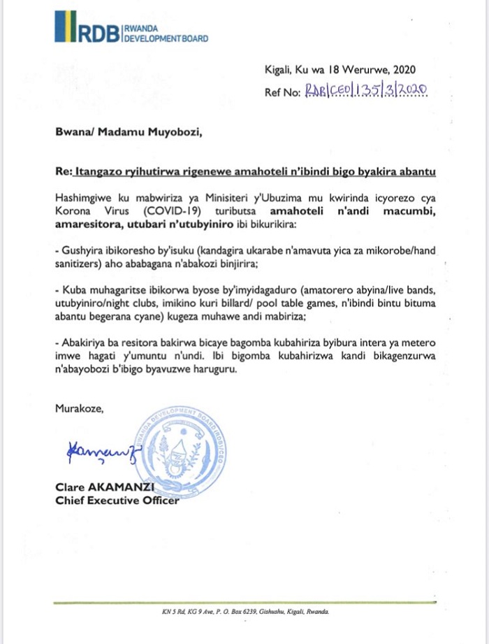 Hashingiwe ku mabwiriza ya Minisiteri y’Ubuzima agamije kwirinda icyorezo cya COVID-19, Urwego rw’Igihugu rushinzwe Kwihutisha Iterambere (RDB), rwasabye amahoteli, n’andi macumbi, amaresitora, utubari n’utubyiniro gushyira ibikoresho by’isuku (kandagira ukarabe n’amavuta yica za mikorobe (hand sanitizers) aho ababagana n’abakozi binjirira.