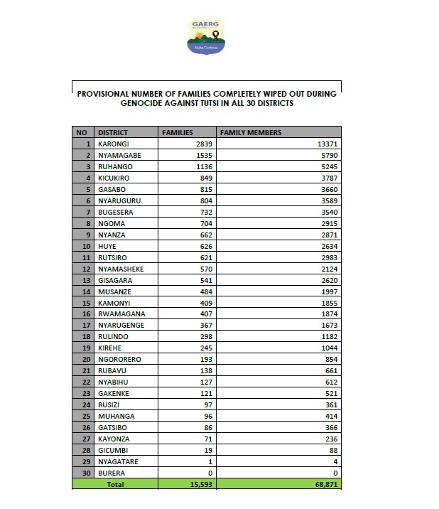 GAERG imaze kubarura imiryango yazimye mu turere twose tugize u Rwanda uko ari 30. Imibare igaragaza ko hari imiryango yazimye ibihumbi cumi na bitanu na magana atanu na mirongo icyenda n’itatu (15,593) igizwe n’abantu ibihumbi mirongo itandatu n’umunani na magana inani na mirongo irindwi n’umwe (68,871).