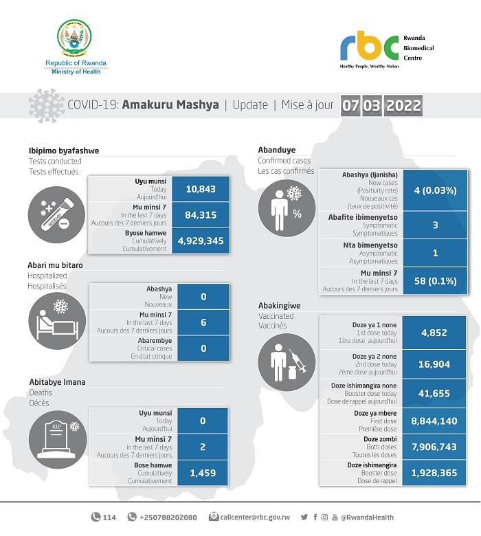 Minisiteri y’Ubuzima (MINISANTE) yatangaje ko ku wa Mbere tariki 07 Werurwe 2022 mu Rwanda habonetse abanduye Covid-19 bashya bane (4), bakaba babonetse mu bipimo 10,843.