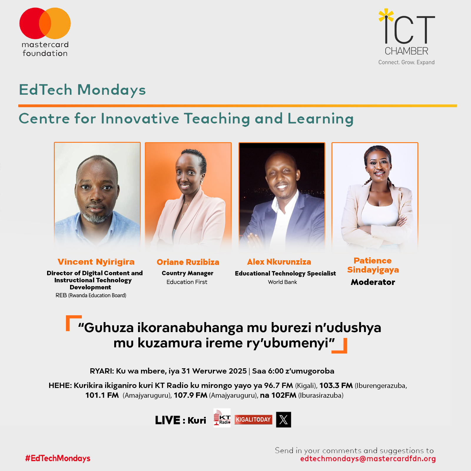 Ibi byose bizasesengurwa mu gice cy’ikiganiro EdTech Monday, ni ikiganiro gikorwa ku bufatanye na Mastercard Foundation kigaruka ku iterambere mu burezi bushingiye ku ikoranabuhanga, kikazatambuka ku ya 31 Werurwe 2025, kuri Radiyo KT 96.7 FM.